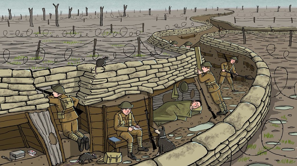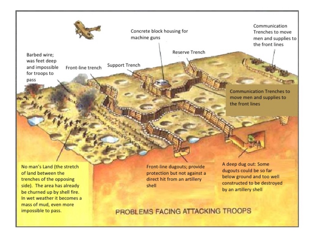 WWI became a total war. Governments mobilized all resources (economy, population, industry) for victory, leading to unprecedented scale and destruction. The Western Front (France/Belgium) epitomized this as a war of attrition: neither side could achieve decisive breakthrough, so battles aimed to wear down the enemy through massive casualties and resource exhaustion.Trench warfare dominated after late 1914: Soldiers lived in elaborate networks of trenches (front-line, support, reserve) separated by “No Man’s Land” filled with barbed wire, craters, mud, rats, and disease. Attacks involved “going over the top” into machine-gun fire, often resulting in minimal gains at huge cost (e.g., Somme 1916: 1 million casualties for around 6 miles).